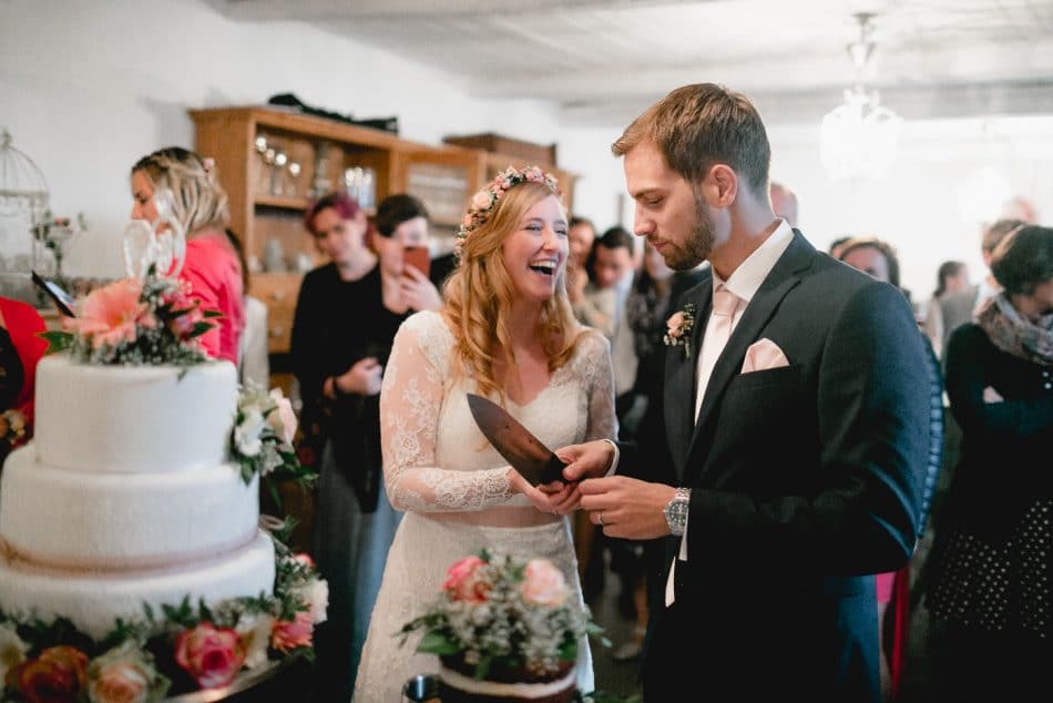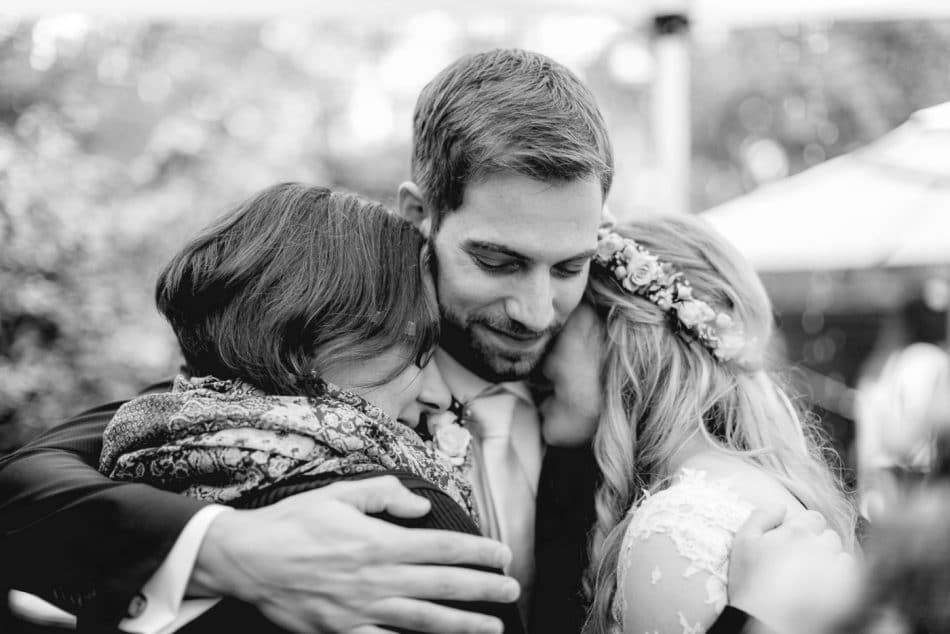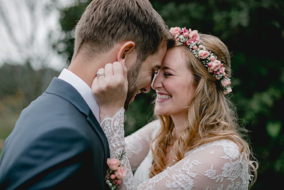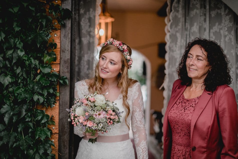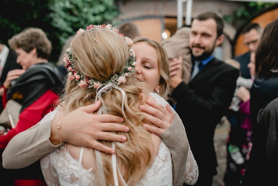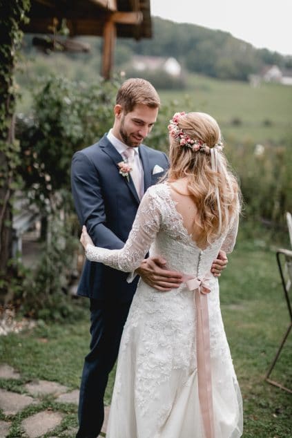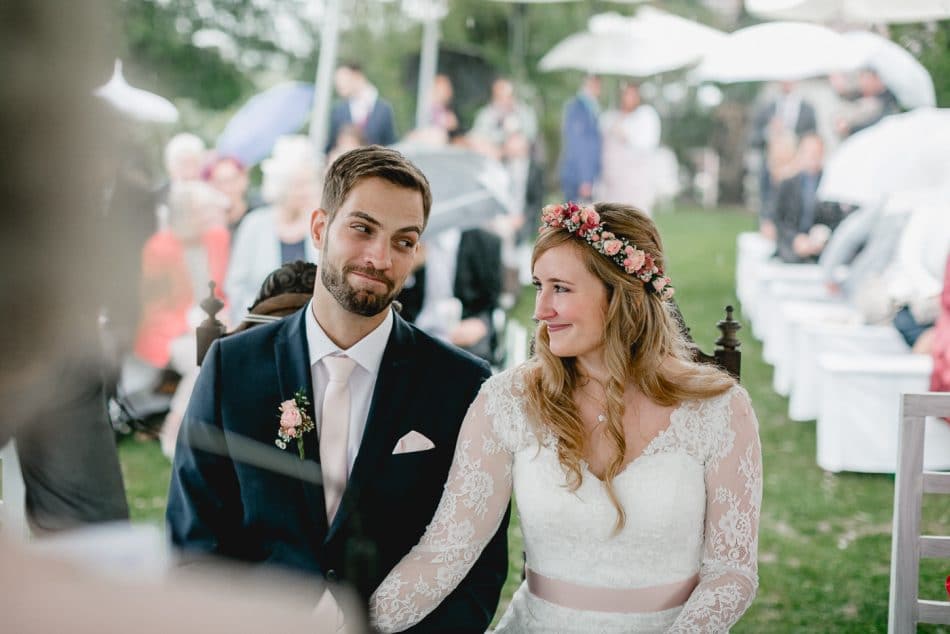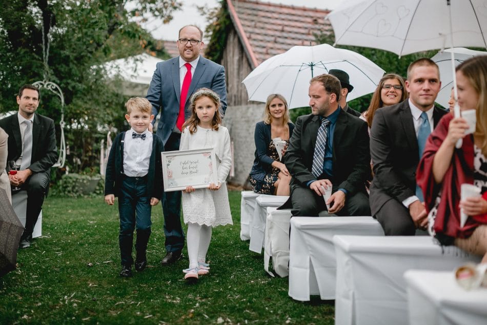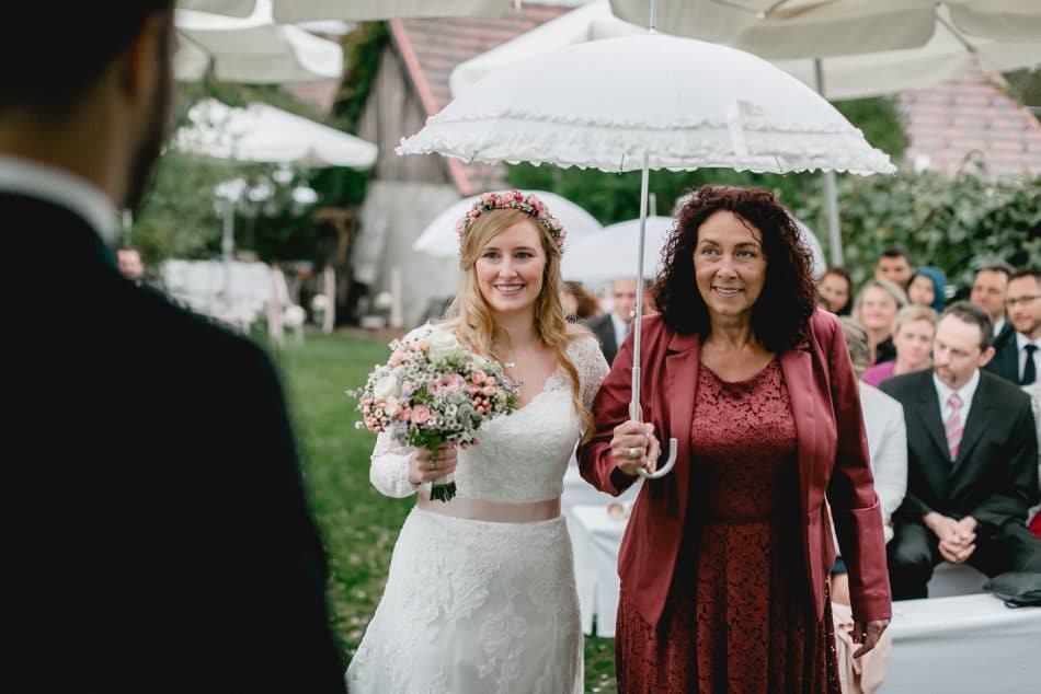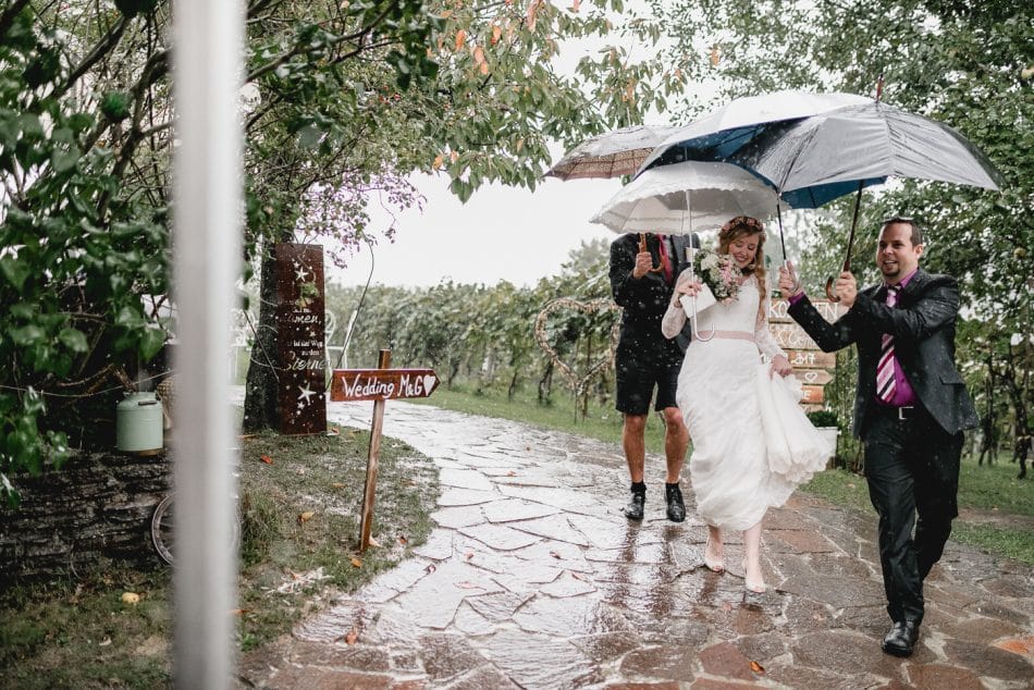 Auch Martina und Gernot hatten eine Gartenhochzeit geplant. Dass kurz vor der Trauung der Regen begann und während der Trauung immer stärker wurde, war kein Problem. Kurzerhand wurde einfach die freie Trauung kurz unterbrochen und in die nahegelegene Scheune verlegt. Das tat der romantischen Stimmung keinen Abbruch. Es war einfach ein wunderschöner, emotionaler und herzlicher Tag.