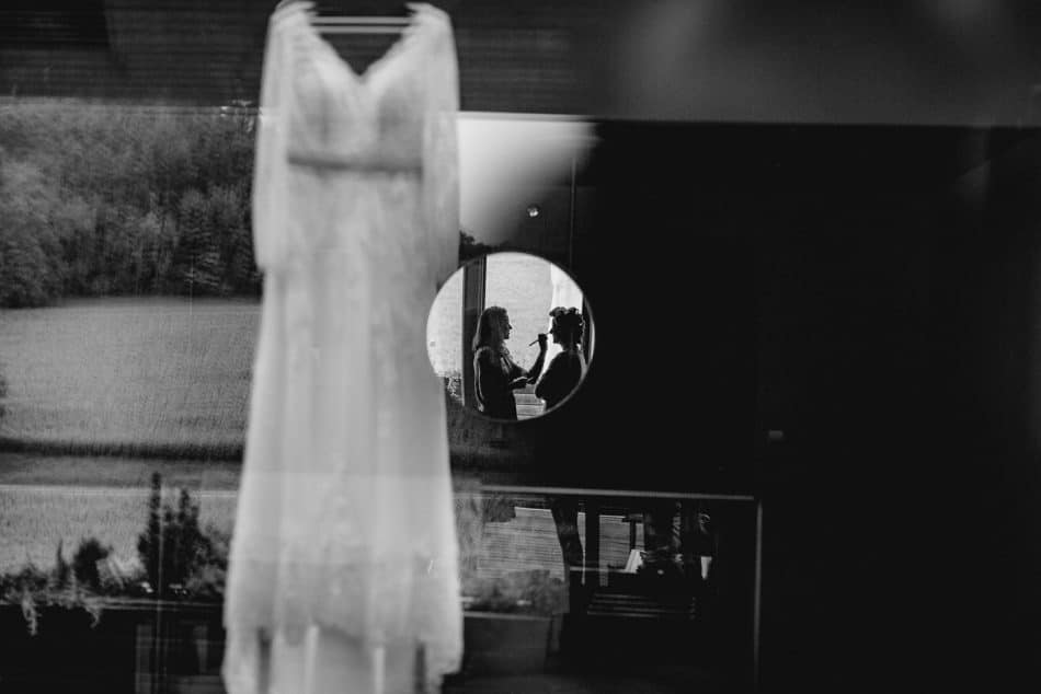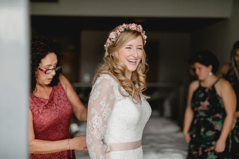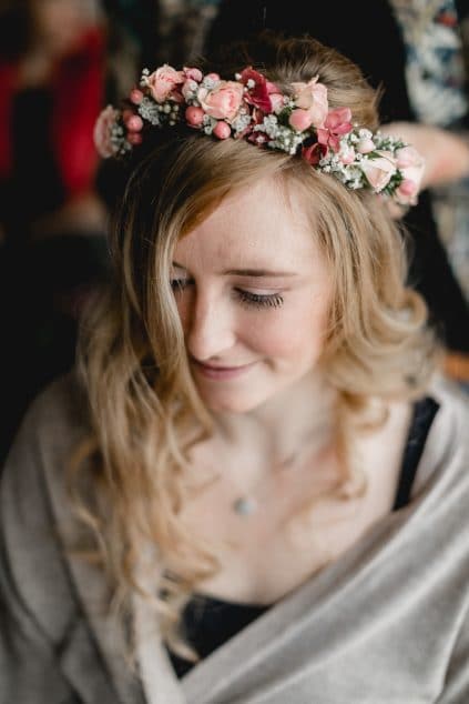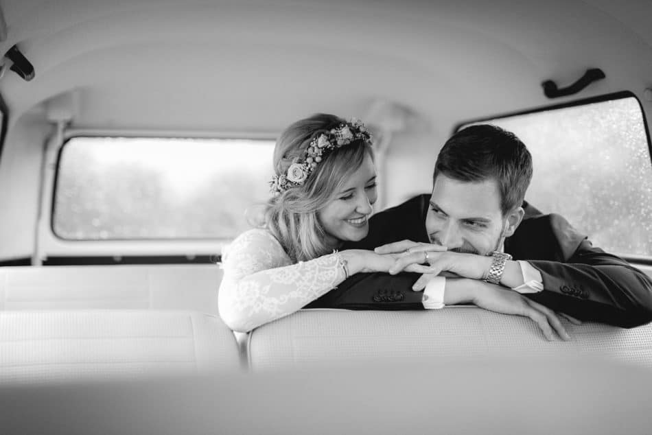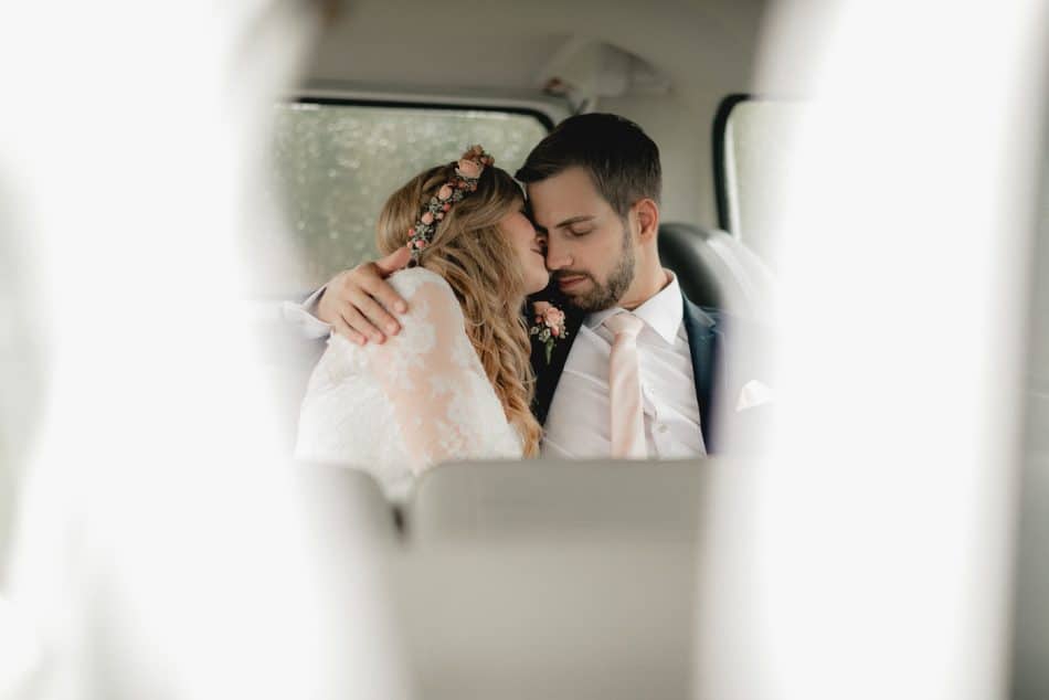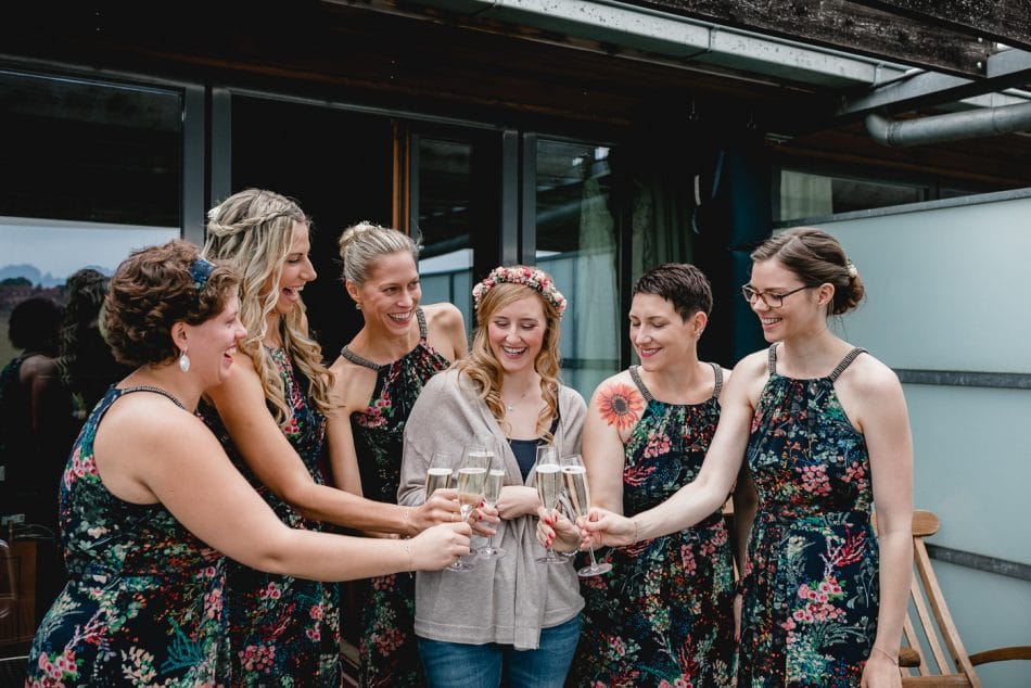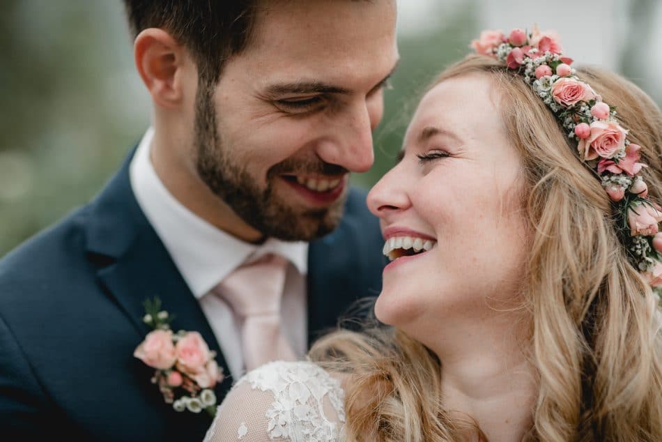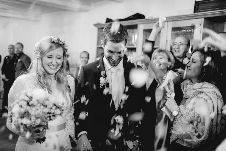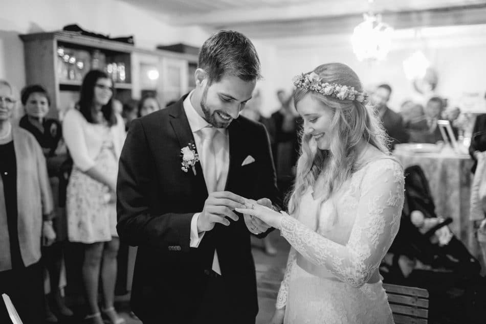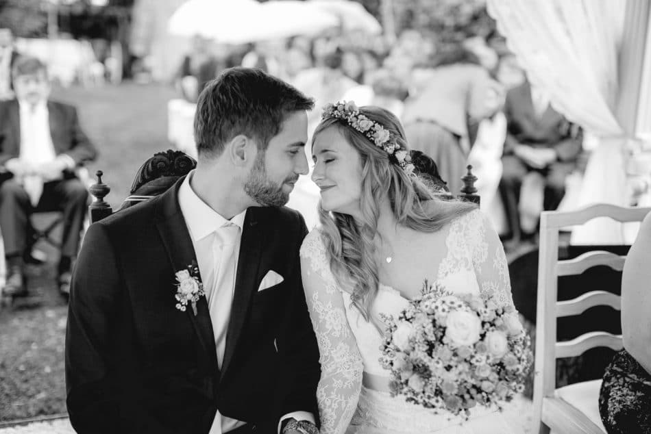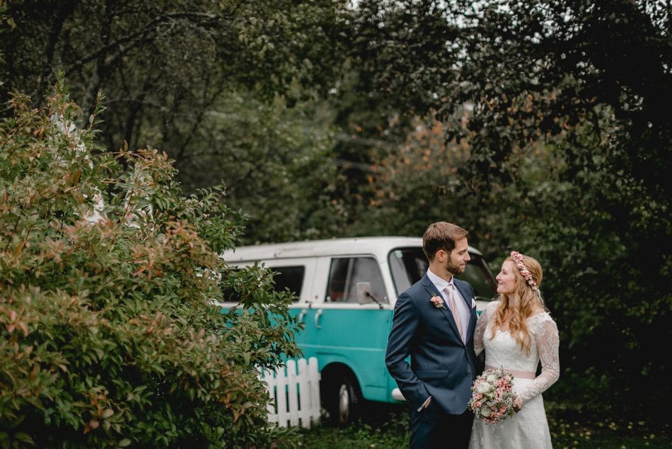 Auch Martina und Gernot hatten eine Gartenhochzeit geplant. Dass kurz vor der Trauung der Regen begann und während der Trauung immer stärker wurde, war kein Problem. Kurzerhand wurde einfach die freie Trauung kurz unterbrochen und in die nahegelegene Scheune verlegt. Das tat der romantischen Stimmung keinen Abbruch. Es war einfach ein wunderschöner, emotionaler und herzlicher Tag.