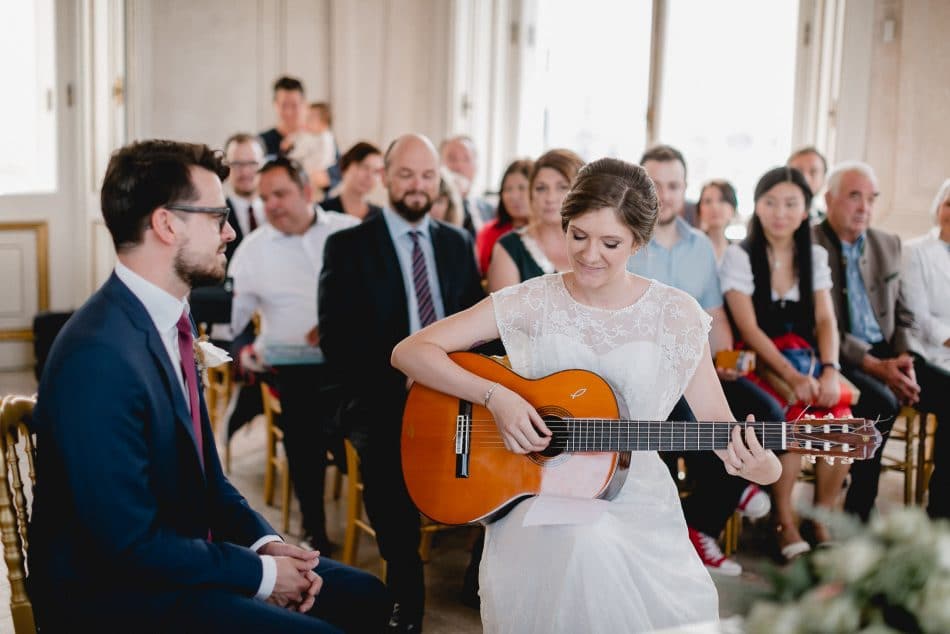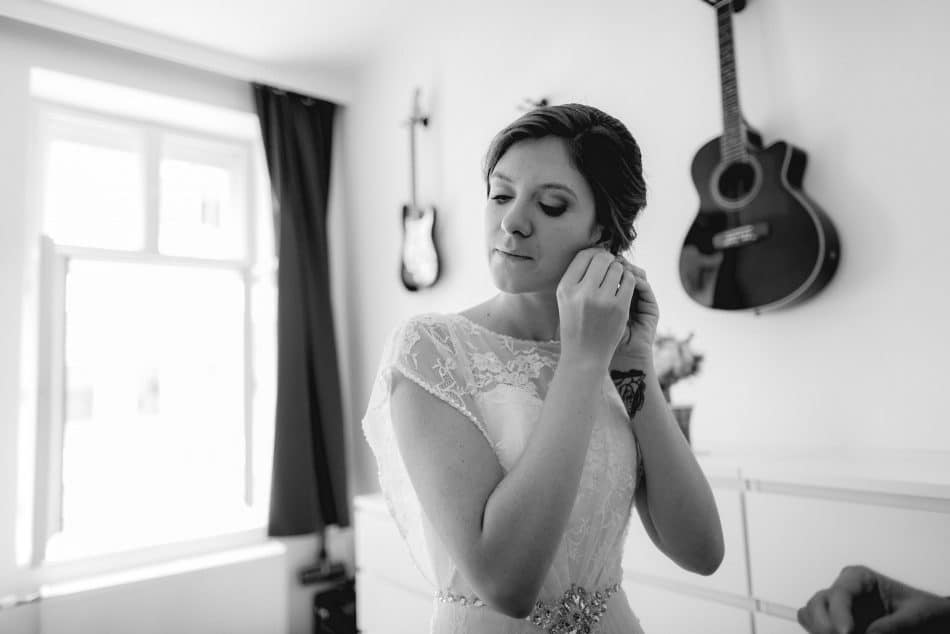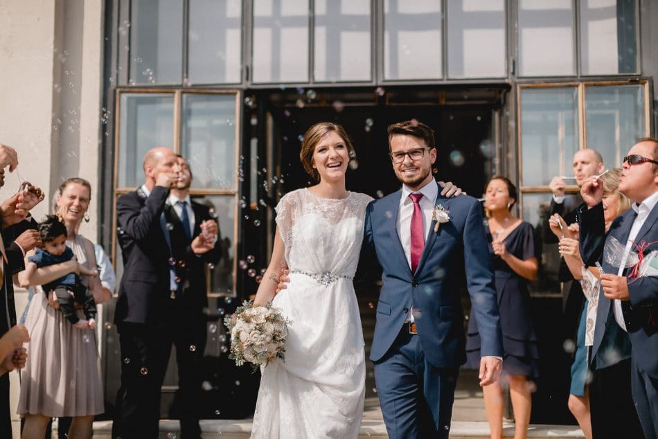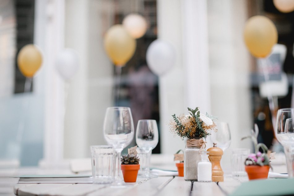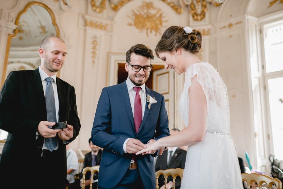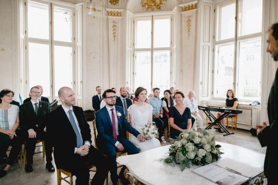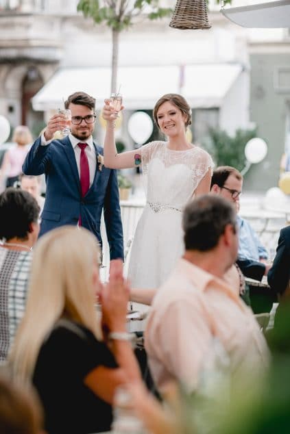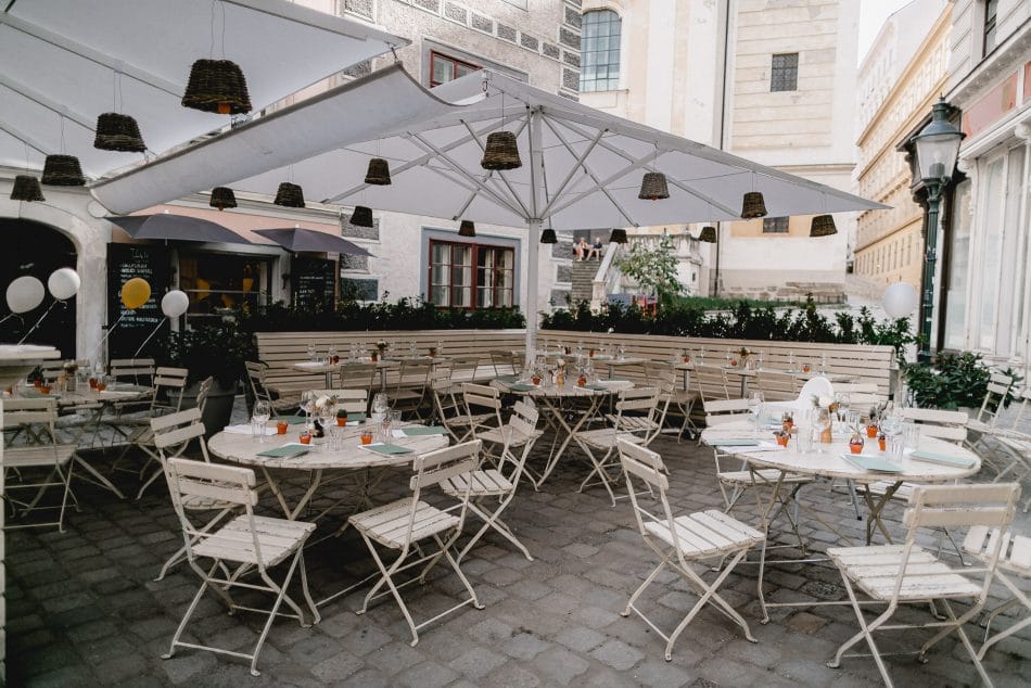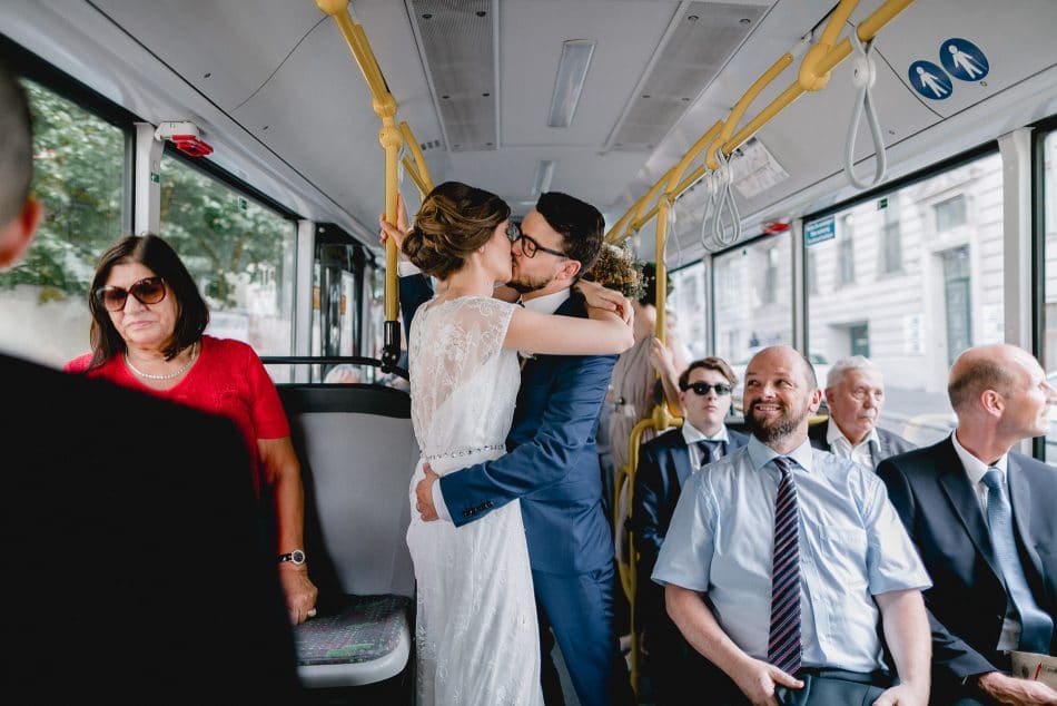 Die standesamtliche Trauung fand im Schloss Belvedere statt. Es war eine sehr berührende Trauung, vor allem als Lisa ihrem Bräutigam ein selbst geschriebenes Lied sang. Danach ging es für alle Gäste gemütlich in einem gemieteten Bus der Wiener Linien zur Hochzeitslocation. Das Erich im 7. Bezirk ist eigentlich gar keine Hochzeitslocation, die beiden haben ihr kleines Lieblingslokal für diesen Tag aber exklusiv gemietet um mit der Familie und den engsten Freunden diesen Tag noch gemütlich ausklingen zu lassen und auch gebührend zu feiern.